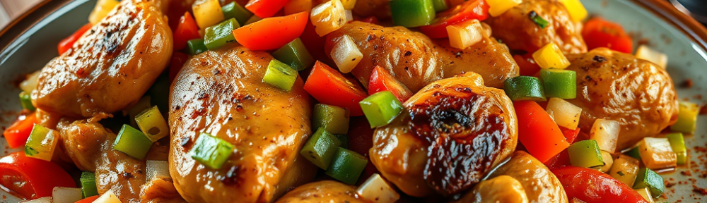 3 large pieces of chicken, One very large onion, half peppers each: green, red, and yellow to make it colourful, garlic, a tin of chopped tomatoes, lots of spices of your choice, curry powder, pepper, salt.